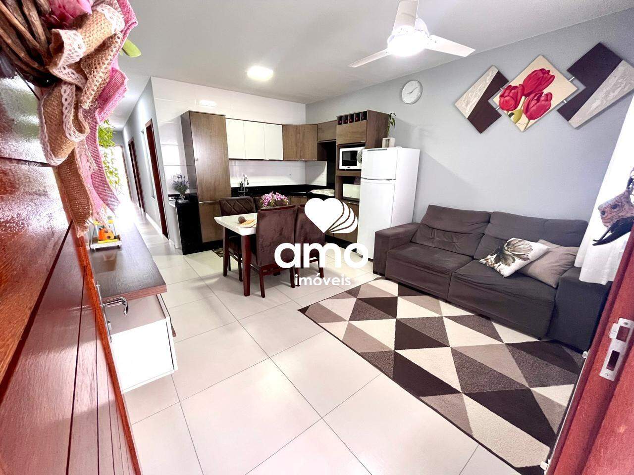 Oferece ainda área de serviço, armário na cozinha e box no banheiro. Localizada em Brusque, SC, atende quem busca praticidade e conforto em uma residência pronta.